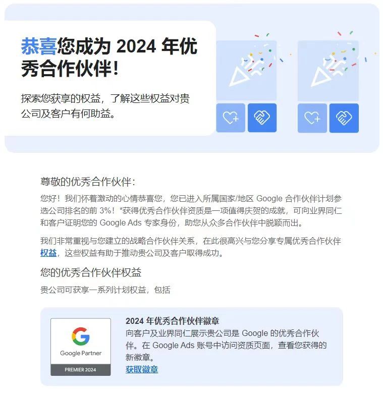 這次再次獲得谷歌2024年度的認可,不僅證明了谷歌對第一頁業(yè)務的高度認可,也意味著第一頁將繼續(xù)接收來自谷歌官方Google Ads領(lǐng)域最新的專業(yè)知識,以更好地為客戶提供服務。
