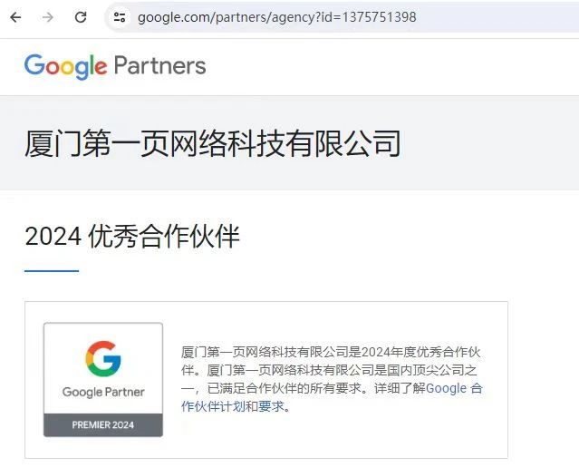 2024年2月,廈門第一頁網(wǎng)絡科技有限公司榮幸地成為谷歌2024年度的"優(yōu)秀合作伙伴"之一。